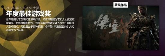 国产游戏《黑神话:悟空》凭借其精良的制作和精彩的剧情接连斩获 Steam年度最佳游戏奖、纵使手残仍大爱奖 和 杰出剧情游戏奖 三项大奖。
