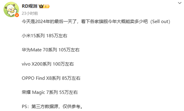 近日,CNMO注意到,有数码博主汇总了2024年华为、小米、OPPO、vivo、荣耀这五大国产手机厂商最新款年度旗舰的销量数据。