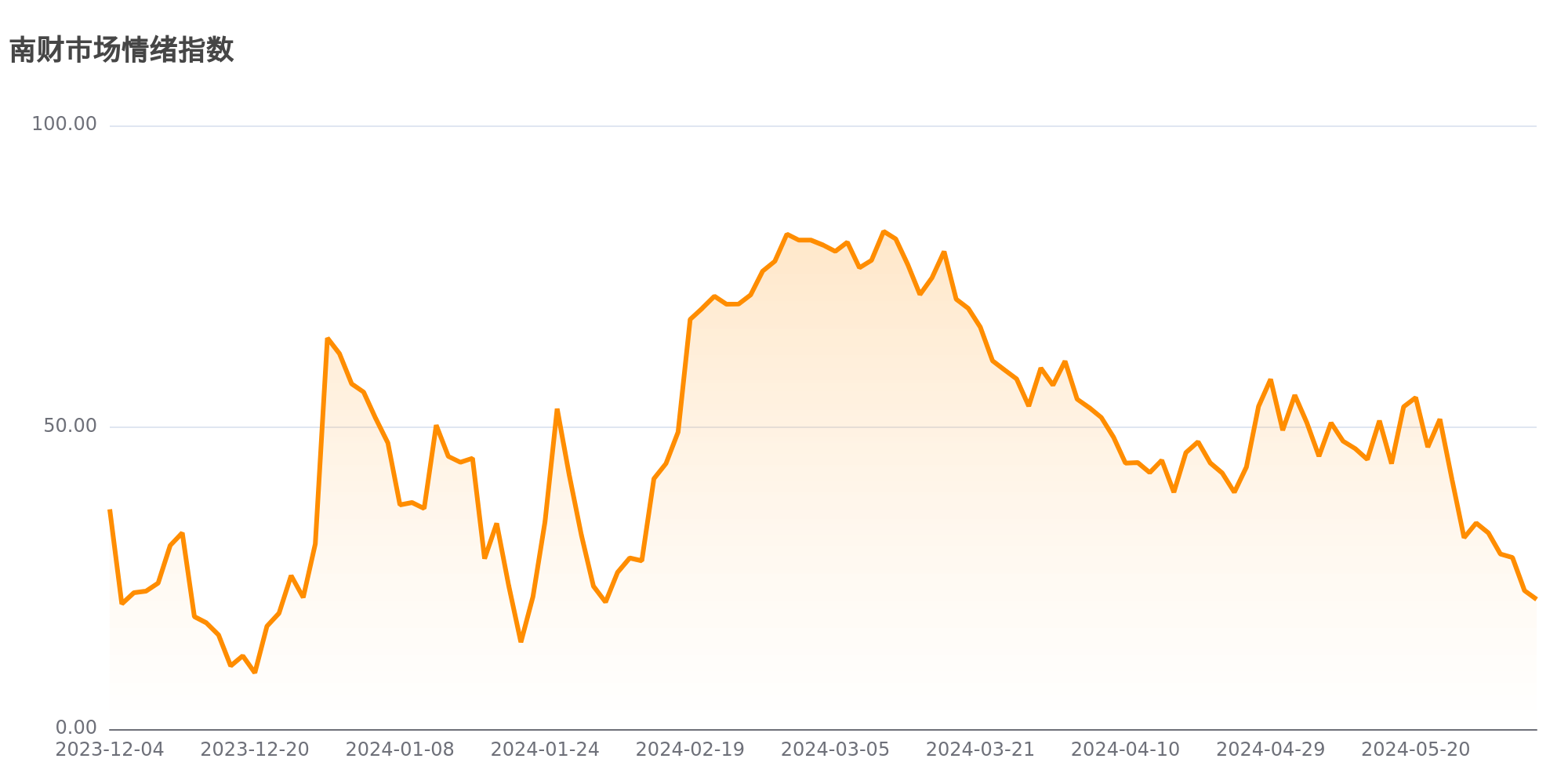 今日南财市场情绪指数为21.5,较前一交易日22.9下跌,市场投资热度降低。