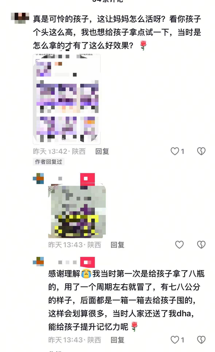 在相关评论区,不少网友表达惋惜与慰问,也有不少网友询问具体情况。然而,内容发布者对这些评论均不予回应,仅答复了一些类似“孩子长得这么高没少花费功夫培养吧”的问题,回复内容大致为:“孩子之前不高,吃了某产品之后,一年多就长高了很多。”更有内容发布者,直接发布某购物平台的商品图片,向咨询的网友推荐。
