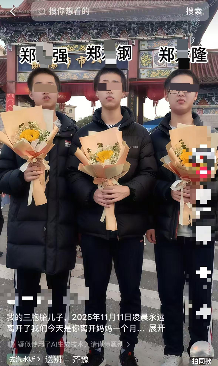 极目新闻记者注意到,在某短视频平台内容搜索框输入“三胞胎离世”等话题词后,会出现上百条类似的图文内容。这些图片中多为三名长相类似、身穿校服或休闲装的青少年,姓名中常含“龙”“麒”“麟”等字。这些内容多为单一图片,常配以《送别》音乐及统一文案,如“我的三胞胎儿子(女儿或孩子),2025年某月某日凌晨永远离开了我们,今天是你离开妈妈一个月了……”。奇怪的是,有些图片中仅有两名青少年,但配文仍是“我的三胞胎孩子”。