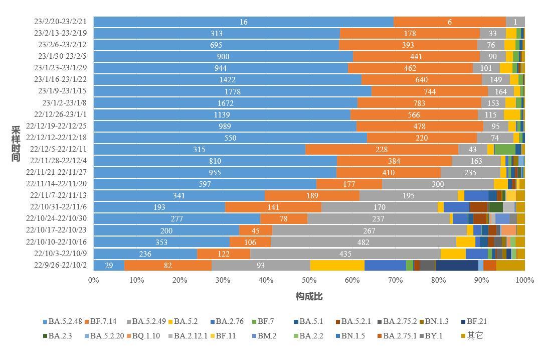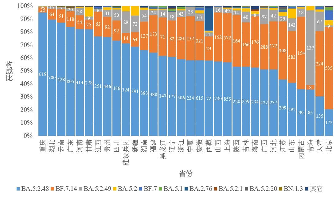 2.图中标记的数字分别为BA.5.2.48、BF.7.14和BA.5.2.49进化分支有效基因组序列数量。