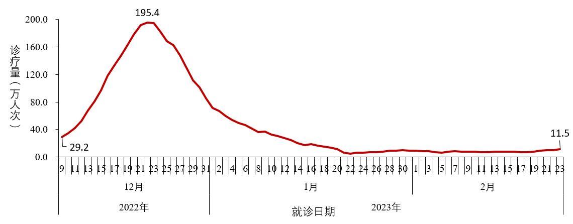 (三)城市发热门诊就诊人数结果。全国二级以上医疗机构和城市社区卫生服务中心发热门诊(诊室)就诊人数于2022年12月22日达到峰值195.4万人次,随后连续下降;1月23日后呈低位波动,2月23日为11.5万人次,较峰值下降了94.1%(图2-3)。