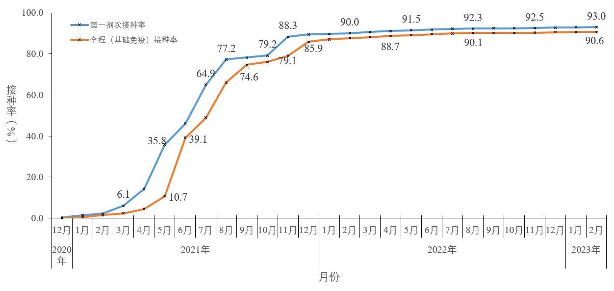 以2022年底全国老年人专项摸底调查人口数为基数统计,截至2023年2月23日,60岁以上老年人第一剂次接种覆盖人数占老年人群的96.1%,全程接种、第一剂次加强免疫接种人数分别占符合接种时间间隔老年人群的96.6%、92.4%(图5-3)。